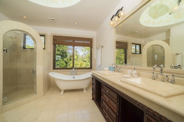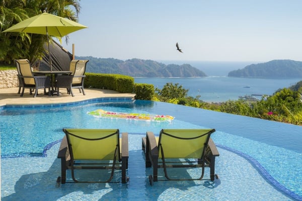 Casa Puesta del Sol is a beautiful five-bedroom home located in the mountain-top neighborhood of Vista Tres Bahias in Los Sueños Resort. With an elegant design and stunning panoramic vistas of three different bays and the rainforest this home is ideal for families and groups that want to have a private house within Los Sueños with privacy and the best views. Puesta del Sol means sunset in Spanish and this is one of the things you will enjoy the most while staying at this home. Puesta del Sol offers you large terraces to relax and a large infinity pool with jacuzzi from where you and your group can enjoy the magnificent surroundings. Indoors you will enjoy large living spaces, dining room, and a fully equipped kitchen with stainless steel appliances.