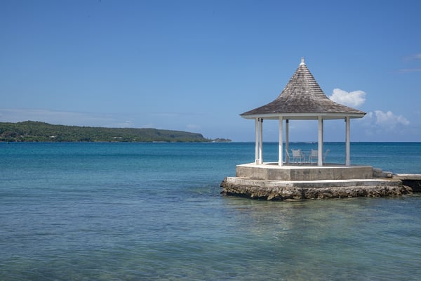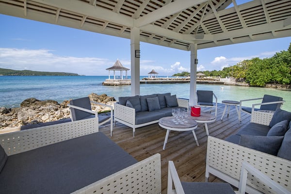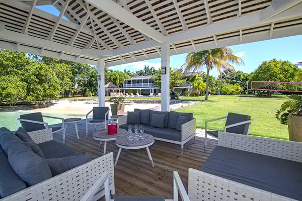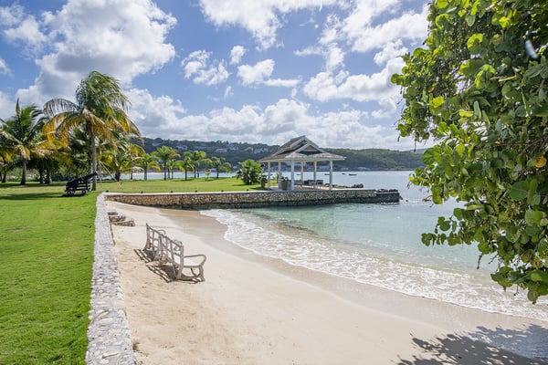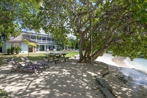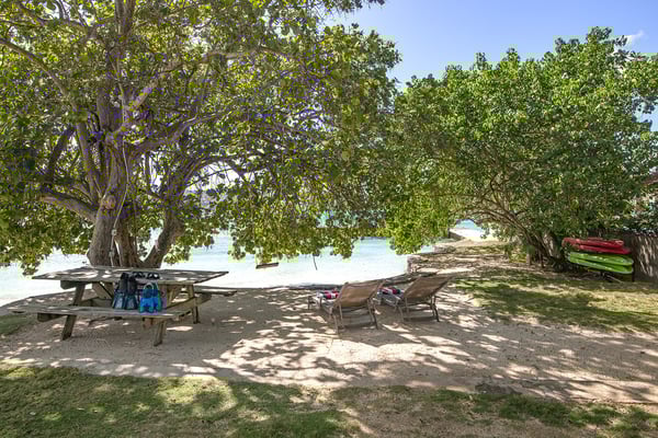 Nestled on its own sandy beach by the blue waters of Discovery Bay, A Summer Place is a spacious and playful family home. The design is of typical Caribbean gingerbread style with hand carved fretwork trimming the length of the house. The design is of typical Caribbean gingerbread style with hand-carved fretwork trimming the length of the house. The large open-plan living room features an entertainment center with a 30" DSS TV, VCR, and assortment of videos for all ages. French doors open from the living room to a 15-square-foot furnished veranda. Charmingly draped with beautiful Thunbergia blossoms, the veranda is the heart of this happy home. On this covered terrace, guests can read, play games, snooze, and watch hummingbirds feed on the flowers or just take in the magnificent beauty all around while being quite near the action at the private pool and beach. All around are mesmerizing panoramas of azure water and lush green hills. Multicolored bougainvillea, hibiscus, sea grape, almond, ginger lilies, and coconut adorn the manicured grounds. A large sideyard invites playful children to romp to their hearts' content. Mouth watering home cooked meals include Jamaican, American, and Continental specialties. Memorable meals are served on the terrace or in the more formal dining area on a 250 year old family heirloom table that seats 14. On special occasions, dinner is served in the pool gazebo or in the main gazebo at the end of the jetty. The waterfront gazebo is also a favorite spot for massages, cocktails and watching glorious sunsets across the bay. From the pool terrace, it's only a few steps onto the 100-foot white sand beach. Guests are invited to use the snorkeling equipment and sea kayaks for great fun on the beautiful water here.