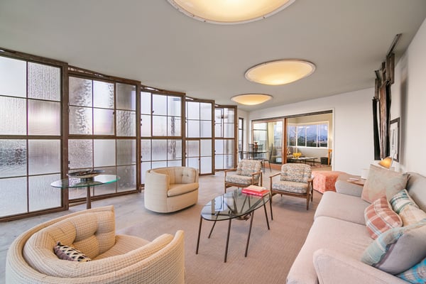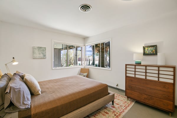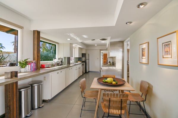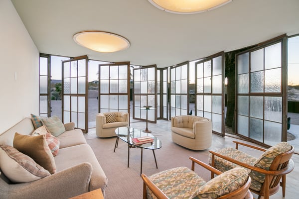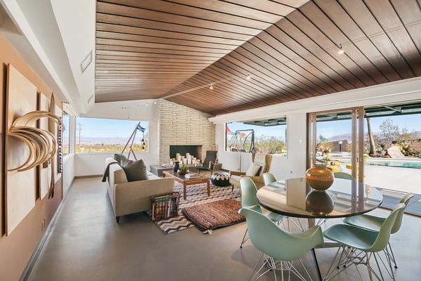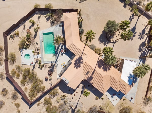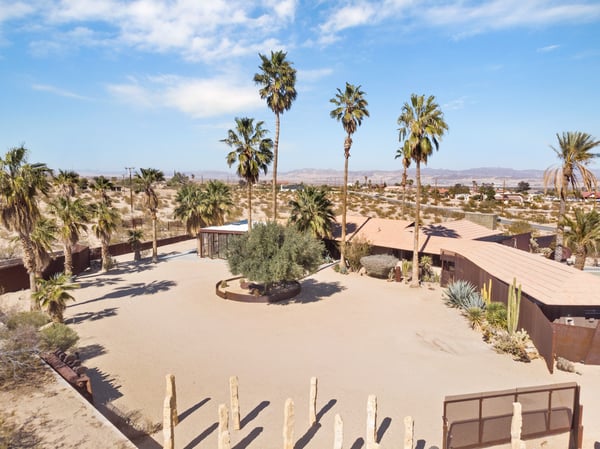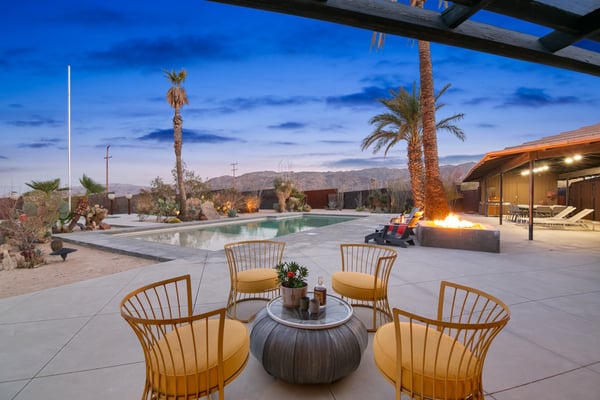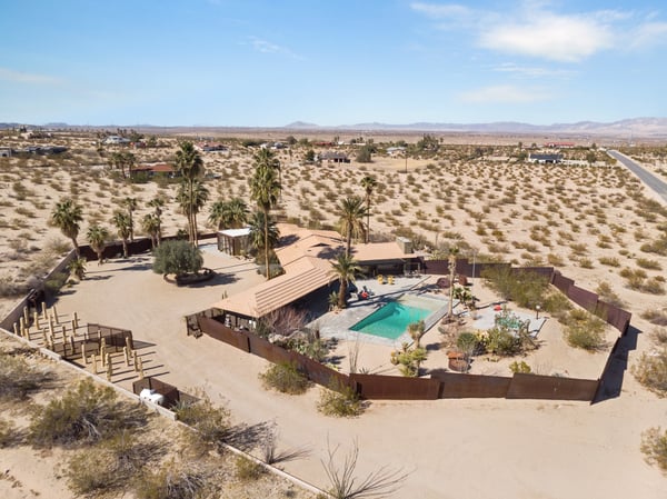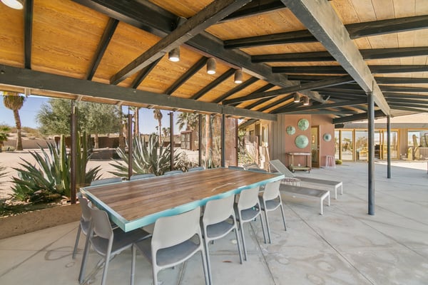 The Wheelhouse is an artistic high-desert retreat formerly owned by TV personality Huell Howser. A rare example of mid-century modern architecture deep in the California desert, the 2,221 square-foot ranch sits on 12 acres of untouched desert near both entrances of Joshua Tree National Park, offering a feeling of total seclusion less than an hour from Palm Springs with 360-degree mountain and desert views. An avid collector of found materials and repurposed objects, Howser turned quarry stones into yard sculptures and industrial elements into lighting fixtures. Five large millstones, each more than 100 years old, surround the full-length backyard pool, giving the home its name. In the early 2000s, Howser added a sunroom extension, created by panels of etched glass, and a separate living room and dining area in the same industrial style, making the home further suited to large gatherings. Now owned by an artist, The Wheelhouse has preserved the industrial qualities that Howser introduced, while incorporating personally created pieces that mirror his style. The light-filled living room, features three owner-created pieces, including a triptych on plywood, a unique wood-based tripod lamp, and a sunset-hued tree light. The gourmet kitchen features a four-seat breakfast nook, stainless steel appliances, the original 50’s stove and plenty of counter space, with a door leading directly outside for easy al fresco dinners. A mid-century dining area features a marble top table with six Eames shell chairs and sliding glass doors that open onto the zero-scaped patio. A den, featuring a large-screen TV and writing desk, provides additional accommodations with a queen sleeper sofa, allowing the home to comfortably sleep 7 guests. Outside are the elements that truly set the home apart. Howser’s industrial accents remain decades after installation, creating the feeling of a modern sculpture garden. An architect designed paneled steel fence surrounds the perimeter, each piece thoughtfully laid in the ground at the same angle as the mountains beyond. The back patio opens to a full-length swimming pool with baja tanning shelf and outdoor spa surrounded by chaise lounge chairs. Please note the pool is not heated; however, the spa is heated. A vintage two-seat swing, nestled just off the living area, offers the perfect place to take in the views. Also outside is a 12-seat al fresco dining area, which converts into a ping-pong table. A gas BBQ grill and indoor/outdoor stereo system complete the ultimate desert entertaining experience. Honoring the communal spirit encouraged by Howser, The Wheelhouse has become a place for celebrations, gatherings, and creative retreats. Artists have used the home to write, draw, meditate or practice yoga. Photographers have used the space for creative shoots. And couples have made the retreat their own, taking their vows against the rocky cliffs and desert brush that surround the home. Between indoor and outdoor spaces, The Wheelhouse can comfortably host up to 120 guests for a cocktail reception and 75 for a seated dinner.