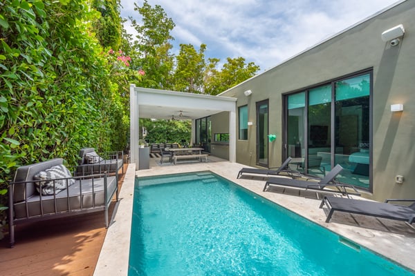 New construction luxury contemporary designer built and decorated house. A gem in the Design District, walking to restaurants and shops. Custom high-end kitchen with top-of-the-line appliances, Subzero, Bosch and Wolf. Four bedrooms a den, three full baths, eleven-foot ceilings, oversized marble floor tiles, built-out floor-to-ceiling wood closets, bar area, and laundry room. Outside pool area with 560-square feet covered terrace perfect for entertaining with Coyote gas grill and gas burner and kitchen area. Floor-to-ceiling impact windows, smart house, A/C Nest, security cameras, alarm and electrical shades. Four-car gated parking.