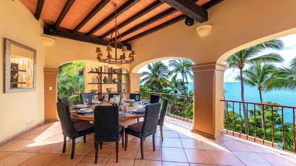 Villa Las Puertas is an elegantly designed seven bedroom Mexican estate with room for fourteen. This 10,750+ square foot villa has plenty of space for your group and overlooks the Bay of Banderas while having direct beach access just 150 steps away down a private staircase. Las Puertas' entrance features a set of astounding Moroccan carved wood doors that open up to a lush courtyard with a private heated swimming pool. There is also a lovely terrace that has a wet bar, multiple living and dining room areas, as well as a large Jacuzzi splash pool. The villa has three levels with the top floor having four bedrooms with access to an outdoor balcony space either private or shared. The main level has two bedrooms, and the lower level has the final secluded bedroom with an ensuite bathroom. All bedrooms have a king-size bed except the 7th bedroom, which is accessed through another room with two twin-size beds, perfect for kids. All but one-bedroom suite have ensuite bathrooms. Walking along the beach, this villa is just a ten to fifteen-minute walk into the Old Town Romantic Zone, or if you prefer to take a taxi or Uber. This property is located next door to Villa Estrella Mar and can be rented in addition should you have a large group that you want to have nearby. Small events with up to 30 total guests are allowed, please inquire for details. No bachelor parties or student groups are allowed.