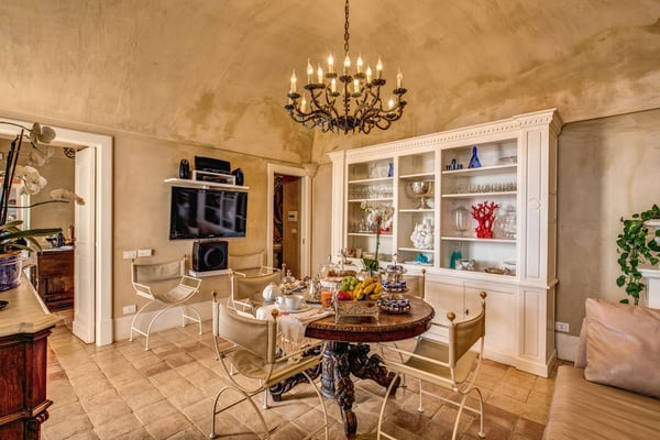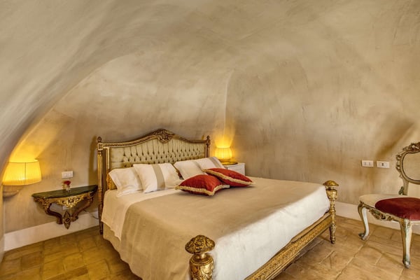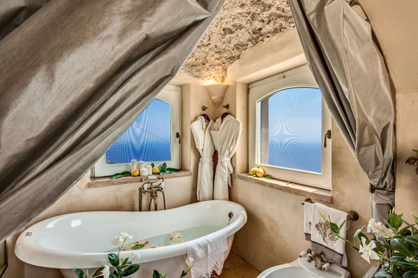Up on a winding road, and just a 20-minute drive from Amalfi and a 15-minute drive from Conca dei Marini, Villa Nume is a beautiful fortified construction dating back to 1500, with original thick walls and a watch tower. Masculine and austere in its exterior look, Nume boasts recently renovated interiors styled in a very romantic and sophisticated way. Perched on an outcrop of a mountain – the villa is reached by several flights of steps down – it overlooks the winding coastline and the stunning turquoise open sea. If you are looking for a quiet private retreat with great service, this idyll will not disappoint you. It is the perfect villa for guests seeking romantic seclusion and the excitement of the Amalfi Coast.