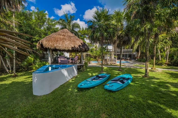 Villa Eden is a luxurious villa located in Cozumel, offering an exquisite experience for those seeking an unparalleled oceanfront getaway. With a 40-foot pool, a deck with easy access to the crystal-clear waters of the ocean, and furniture sourced from all over the world and the local area, Villa Eden provides a unique blend of comfort and elegance. The open living room and kitchen area create a seamless space for relaxation and entertainment, with stunning views of the ocean from every room in the villa. The villa boasts 5 bedrooms, each with its own en-suite bathroom, ensuring privacy and convenience for all guests. For those who love panoramic views, the rooftop of Villa Eden offers breathtaking vistas of the Caribbean, perfect for soaking in the stunning surroundings. The villa also features a lush garden with a 40-foot pool, a palapa, and lounges, providing a serene oasis for relaxation and leisure. For water enthusiasts, Villa Eden offers snorkeling and dive boat pick-up right at the villa, allowing guests to explore the underwater wonders of Cozumel with ease. Additionally, the villa offers the option to rent a 36-foot Fjord boat at a discounted price, complete with lunch and drinks, for a memorable excursion to the clearest waters and beaches in the area. With its stunning amenities, breathtaking views, and unparalleled location, Villa Eden is a true haven for those seeking a luxurious and unforgettable vacation experience in Cozumel.