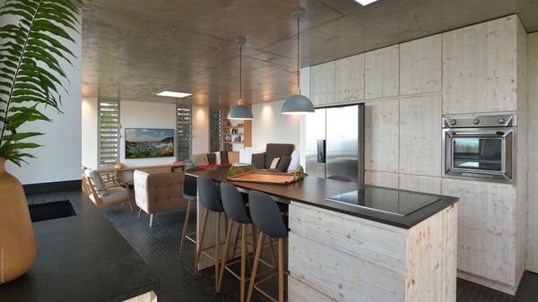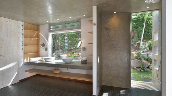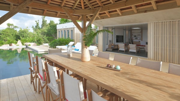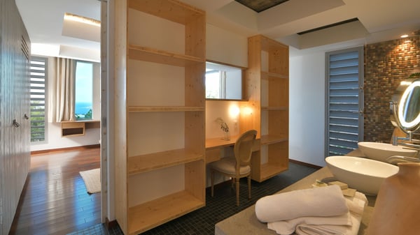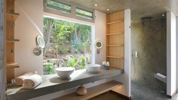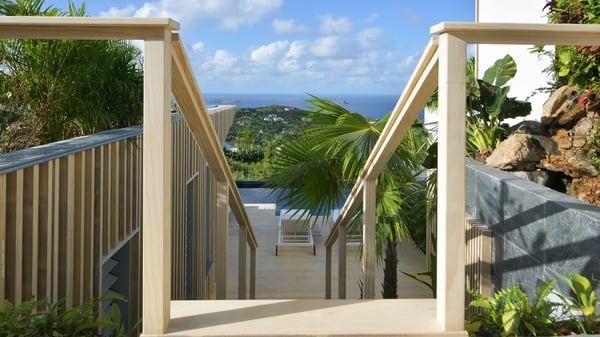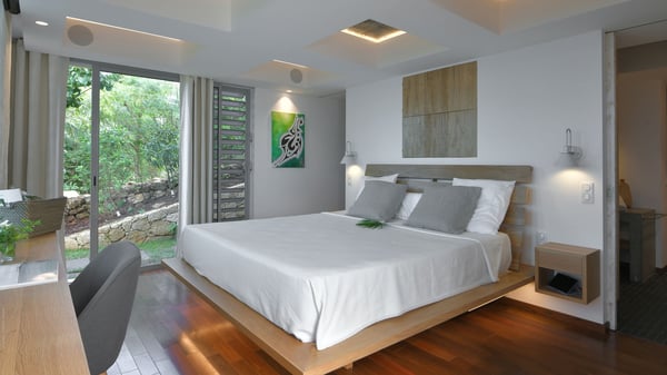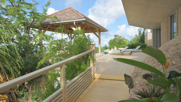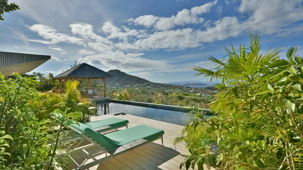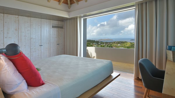 Located in Vitet, the rental villa Nature is a magnificent two-bedroom house ideal for a family or a group of friends. With a stunning view over the Caribbean Sea and the neighbouring islets, nestled in a lush environment, Nature is the perfect choice for your next vacation in Saint-Barthelemy. Villa Nature is a recent property built in a modern style on several levels. Under a waxed concrete ceiling, the bright decor with white wood hints creates a soft and peaceful atmosphere. The comfortable living room overlooks the swimming pool and the ocean, and features sofas and benches covered with cushions facing an HDTV. Warm and elegant, this relaxing space opens onto the well-equipped kitchen with a breakfast bar, for delightful moments. On the terrace, there is a splendid outdoor dining room which can accommodate up to twelve guests, set up under the pleasant gazebo with a view over the Caribbean Sea. The large heated swimming pool is surrounded by lounge chairs that stretch along the length of the large deck. This is the perfect place for sunbathing, reading and talking sessions in the gentle trade winds. On the horizon, the spectacle is strikingly beautiful, between crystal-clear waters, palm trees, chiselled foliage and flowering shrubs. A jacuzzi is also at your disposal, for exquisite relaxing times and enjoying the beauty of nature. With two air-conditioned bedrooms, vacation home Nature is the haven of peace you are looking for on your next vacation in Saint-Barth. They are furnished with king-size beds and are very comfortable, with high-end services, luxury and utmost comfort in an enchanting environment: this is the promise of vacation rental Nature for your next stay in St. Barths.