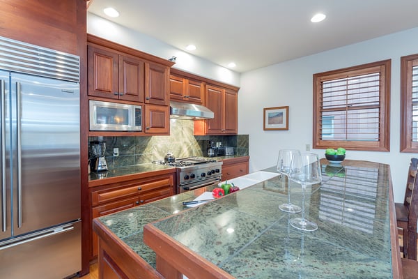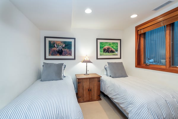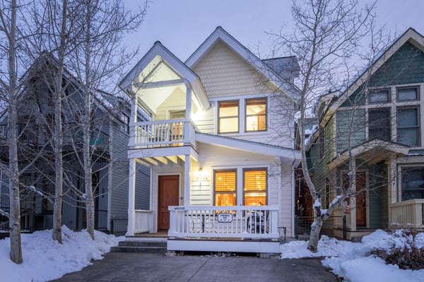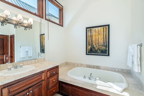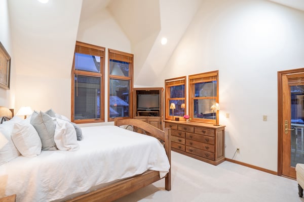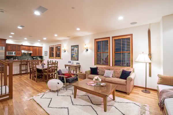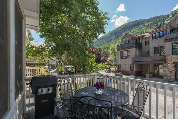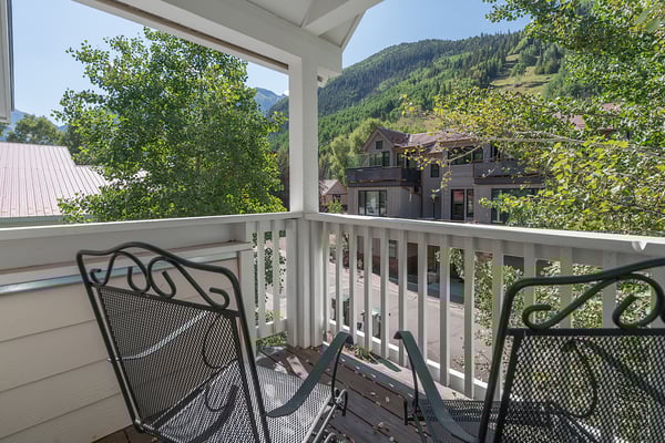 Nearby construction may result in noise disturbances. For further details on how this might affect your stay, please reach out to a villa specialist. A true Telluride classic, South Pacific Townhouse is located on West Pacific Ave, two doors down from the Telluride Medical Center. Just one block south of Main Street and 2 blocks from the gondola, this beautiful and comfortable home is ideal for families and friends alike. Upon arriving to the home's south-facing entrance, visitors have use of a private parking space and are greeted by their own private patio, complete with grill and patio table with seating for four. From here, guests enter into the home to find a spacious living area, with a cozy leather couch, armchair, and built-in window seat sofa surrounded a flat screen TV and gas fireplace and enjoy the Sonos Sound System. The adjacent dining room with seating for six is served by a gourmet kitchen with granite tile countertops, stainless steel appliances and a breakfast bar for two. Rounding out this level is a powder room for convenient guest access. The primary suite occupies South Pacific Townhouse's entire top floor, with a private balcony facing out toward the ski resort, allowing guests to marvel at their own turns at the end of each ski day. The primary bedroom is absolutely beautiful with vaulted ceilings, a king-size bed and en suite bathroom with dual vanity sinks, a large jetted tub and a glass steam shower. The home's lowest level is occupied by two guest bedrooms and a full laundry room. The first is a queen bedroom with an ensuite bath, while the second guest bedroom is a split king room that has a private bathroom across the hallway.