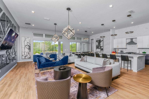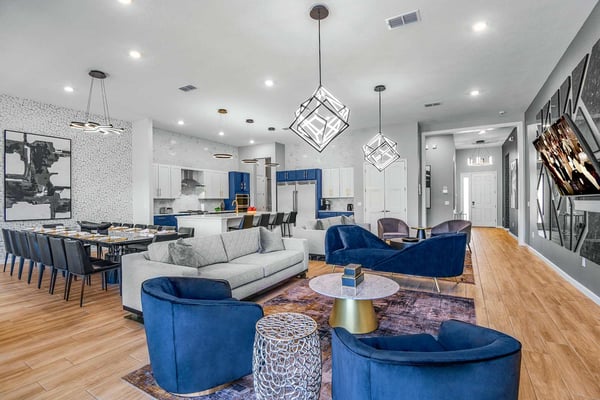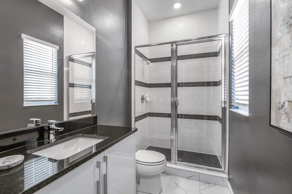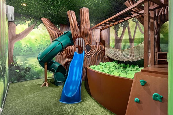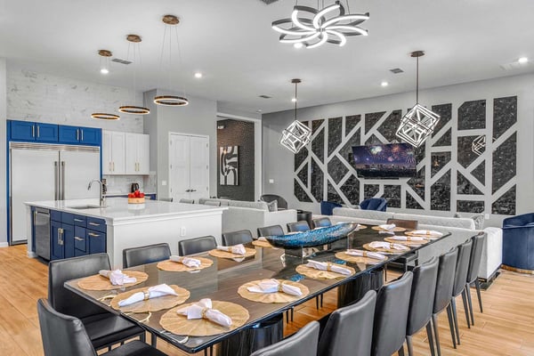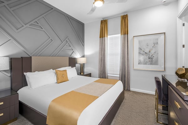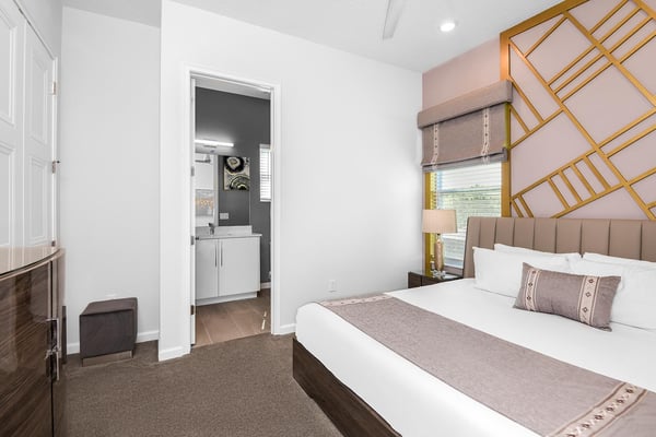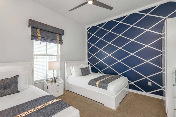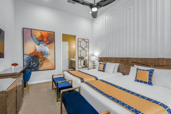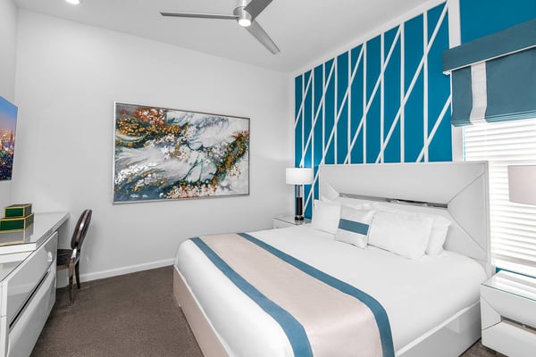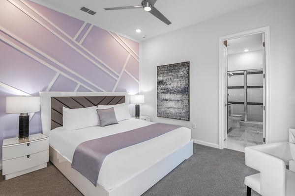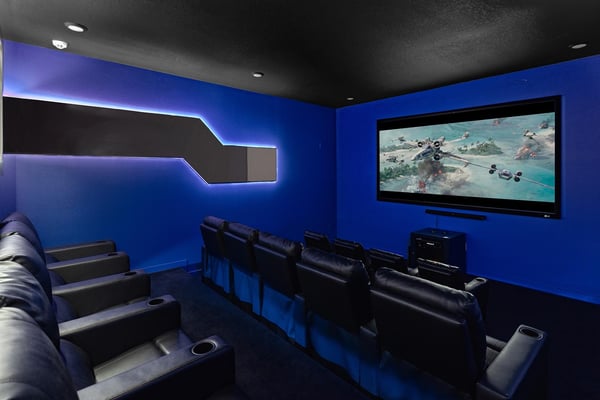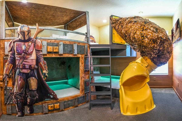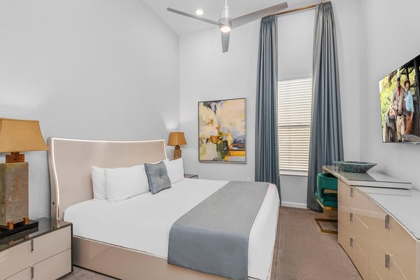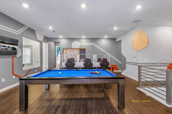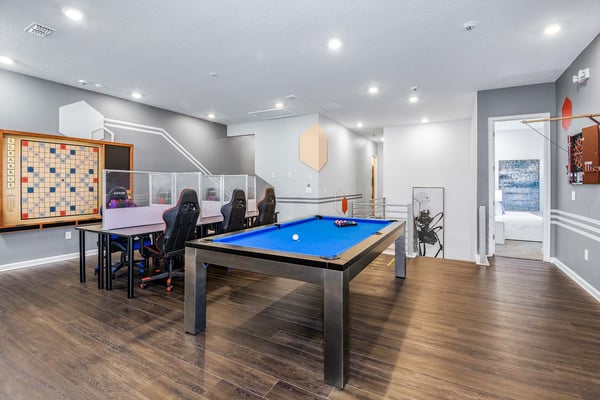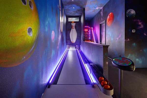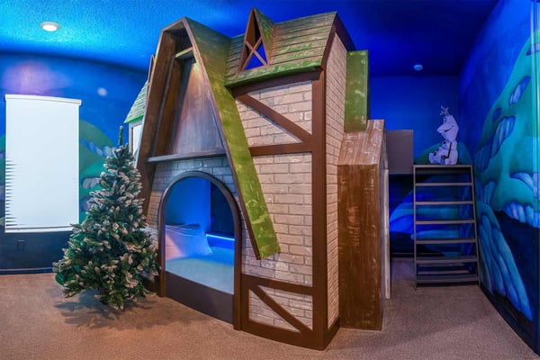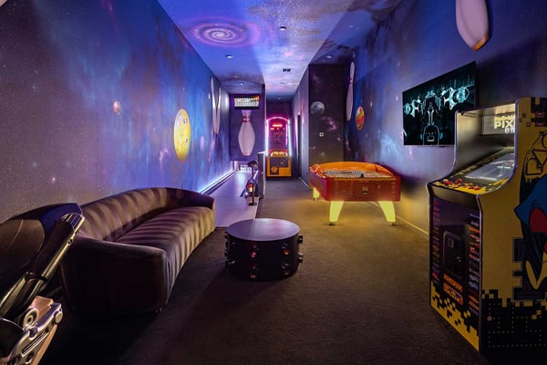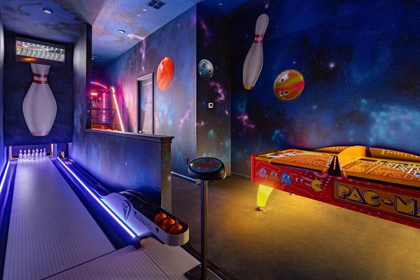 Guests staying at this accommodation will have access to the amenities at Solterra Resort. Resort amenities include tennis courts ($), a lazy river ($), fitness centre ($), covered playground, scenic grounds, as well as its 15,000-square-foot Event & Conference Center, featuring fitness classes, entertainment, food experiences, and ticketed events. Get ready to feel like modern-day royalty at the 11-bedroom villa in Villatel Village. Luxury and grandeur practically ooze through the walls of this crown jewel, which features next-level amenities: a personal bowling alley, movie theater, arcade games, and vast private pool with spa and outdoor kitchen. Little princes and princesses won’t believe their eyes when they see the wondrous Treehouse Playroom with its swinging vines—plus two epic themed bedrooms styled after their favorite movies. This palatial estate—which sleeps up to 28 guests—is impressive from the start thanks to its stylish Contemporary design. Step from the elegant foyer into the oversized great room, where you can unwind with your gang amid plush furnishings, a big-screen TV, and tastefully upscale décor. The open-concept chef’s kitchen is a food lover’s dream with its high-end appliances, blue custom cabinetry, white marble countertops, and light oak floors. Gather around the kitchen island with apps and drinks—then move to the spacious table in the dining area for a sit-down feast. Your family and guests will be bowled over, literally, when you show them the private bowling alley. Between rolls, you can even try your hand at classic arcade games situated in the same room, including Pac-Man, a racing game, and air hockey. Sprawling branches, swinging vines, hidden “tree trunk” nooks, and fanciful wall art have transformed the garage into a play space like none other. Kids (and kids at heart) will love hanging out in this peaceful hideaway where imaginations take root. Just outside, a massive private swimming pool beckons for relaxation or play: Take a soak in the spillover spa, stretch out on a lounge chair, or get your game on with pool basketball, foosball, or ping-pong. And if all that playtime has worked up an appetite, whip up a meal without ever going back inside, thanks to the outdoor kitchen and covered patio. Start thinking of all the blockbuster movies you’ll screen in your very own home theatre. You’ll be so comfy in the reclining seats that you’ll want to make it a double feature. Keep the popcorn and snacks coming! Next to the theatre on the second floor, a roomy entertainment loft is a perfect spot for game nights. Challenge everyone to a game of pool, darts, ring toss, or wall Scrabble. No need to let your workout languish during your vacation. Put the state-of-the-art gym to the test, which features a treadmill, bike, and free weights. You can even connect to apps on the smart TV for virtual training sessions. For the kids, this mansion’s showstoppers are the two wildly imaginative themed bedrooms, which double as playrooms for nonstop fun until lights-out time. Parents: You’ll never have to cajole your kids to go to bed in these dreamy pads. In the Enchanted Forest room, kids will love exploring an alpine wonderland of cozy cottages (aka bunk beds), ladders, and fanciful wall art that will remind them of their favourite ice-themed animated movie. Next door, in the Desert Fantasy room, kids can imagine themselves on a yellow planet in a galaxy far away. Vivid wall art, ladders, and slides will inspire immersive play, while cozy bunk beds will have them dreaming of starship battles where the good guys always win. In addition to the two themed kids’ rooms, nine more sumptuous bedrooms cater to grownup tastes with stunning Contemporary décor and every comfort you can imagine. On the first floor, discover three conveniently located sanctuaries, including two primary bedrooms with king-size beds, and a primary queen bedroom with a double-door walkout to the pool area. On the second floor, not far from the kids’ rooms, you’ll find six more luxe bedrooms, each featuring king- or full-sized bed, high-end furnishings, and a stunning en suite bath.