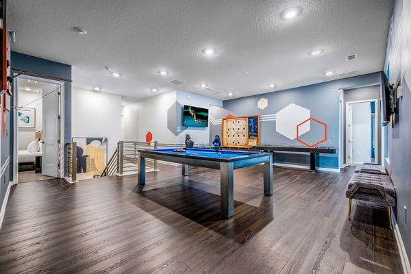 Guests staying at this accommodation will have access to the amenities at Solterra Resort. Resort amenities include tennis courts ($), a lazy river ($), fitness centre ($), covered playground, scenic grounds, as well as its 15,000-square-foot Event & Conference Center, featuring fitness classes, entertainment, food experiences, and ticketed events. Why roll the dice on a family vacation when you can guarantee you’ll win big? By booking the Winning Wonderland in Villatel Village, that is. This palatial mansion is a high-roller’s dream come true, complete with a bowling alley, two themed kids’ rooms, a custom casino room, and so much more. This incredible house is designed to impress from the moment you walk through the front door and into the luxe, Mid-Century Modern great room—perfect for enjoying cocktails or bonding time with your crew. The stunning adjacent kitchen features chic blue cabinets, bright countertops, and top-of-the-line appliances. Huddle around the breakfast bar island for apps and snacks, or feast with the whole family at the spacious table in the dining area. Also on the ground floor are three of eleven bedrooms. Each room is stylishly outfitted with Insta-worthy décor: a neutral palette, marble and metal accents, and luxurious chandeliers, complemented with grand en suite baths. Whichever one you choose, you’ll hit the jackpot. Score some R&R and feel like a million bucks in your private outdoor retreat, featuring a swimming pool, jacuzzi, lounge chairs, and water slide, surrounded by an outdoor kitchen and covered patio. What’s more: this house totally ‘doubles down’ on entertainment. The first floor boasts a one-of-a-kind in-house bowling alley, surrounded by a cozy lounge area and all your classic faves to play between strikes–like air hockey, basketball, and Pac Man. Head upstairs for more fun and games in the game loft, featuring shuffleboard, darts, and plenty of lounge space to socialize and hang out with the crew. Train for the competition in the impressive state-of-the-art gym, complete with a stationary bike, Peloton treadmill, Tonal gym, and free weights. When it’s time to wind down, take advantage of the cozy theatre room—with a front row of recliners designed exclusively for the kids. At the closing credits, they’ll make a beeline for the epic-themed bedrooms. The Enchanted Village room will leave kids frozen with excitement as they step into a picturesque European village with charming sleeping quarters that double as a playhouse - featuring a twisting slide designed to make them feel like they’re gliding from the top of a mountain. Next door in the Superheroes Hideaway, kids will feel like real-life superheroes as they climb into their very own suit of armor (which disguises the coolest set of bunk beds), complemented by steel-gray paint and fluorescent lights—giving the impression that they’re in their own underground hero bunker. In addition to the three adult bedrooms on the ground floor, discover six more upstairs–each with en suite bathrooms, plush mattresses, crisp white linens, and luxe Mid-Century Modern décor.