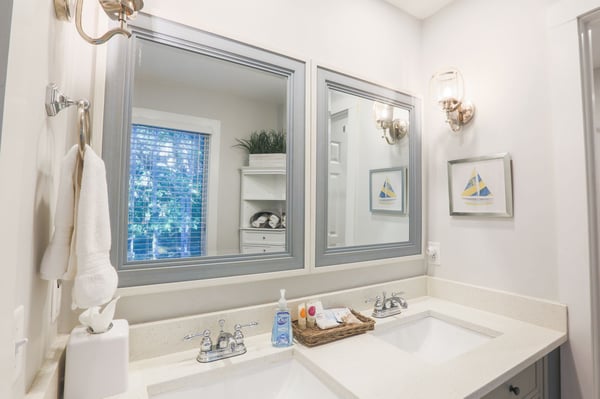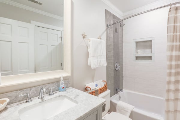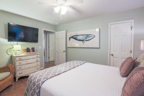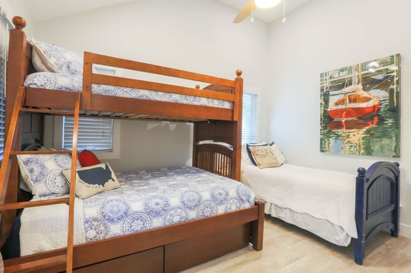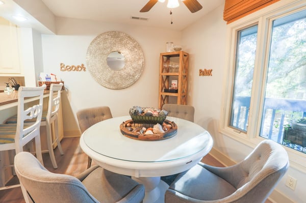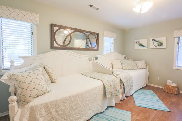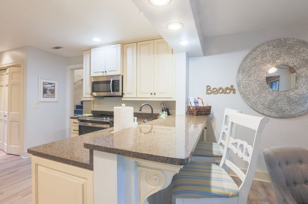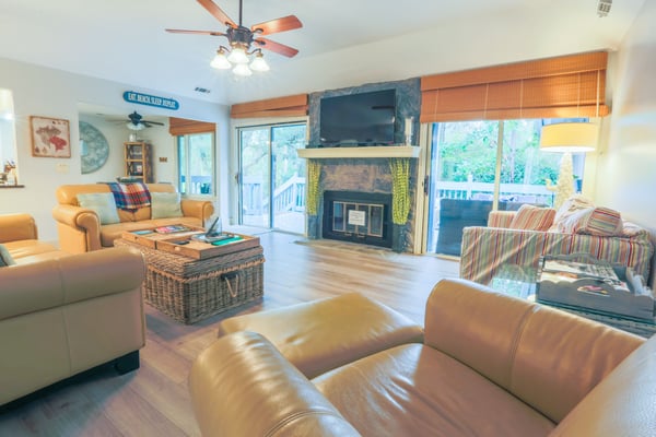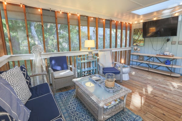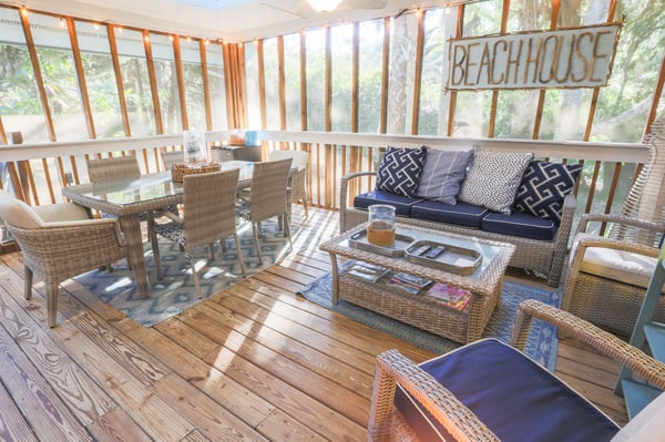 This wonderful, renovated home within the gated Wild Dunes Resort boasts an impressive list of perks and amenities for its guests. Marine House features two primary suites, is a short 10-minute walk to the beach and, best of all, provides a quiet and peaceful retreat within the sun-drenched, bird-filled woods on its screened porch and backyard oasis. Decorated in a coastal casual vibe with soothing interior colour schemes and furnishings, making you feel right at home as soon as you enter the front door or spend any amount of time on the home's screened porch, back deck and backyard area. This comfortable home is a great getaway for a group of family or friends, as there are multiple separate seating areas throughout the home for you and your guests to hang out together and also have the option to relax separately on your own. Guests enter the property via the exterior stairs in the front yard to the front door of this elevated home. Once you enter the front door, you will find a large living room with comfortable seating, laminate hardwood floors and cable TV; a kitchen with granite countertops, white cabinetry and stainless steel appliances and a dining area. On one side of the living room, you will find one of the home's primary suites, the queen guest bedroom, the twin trundle guest bedroom and a hallway bathroom with shower/tub combo. You can access the home's screened porch and backyard area from the living room and one of the home's primary suites. On one side of the kitchen, you will find the home's second primary suite and the bunk bedroom suite. There is a full-sized washing machine and dryer in a closet in the kitchen. Off-street parking on the driveway for up to 4 cars is included.