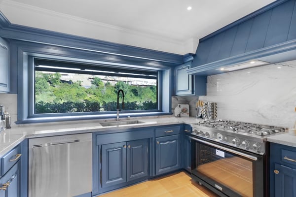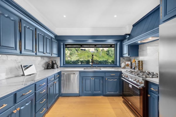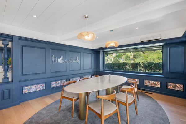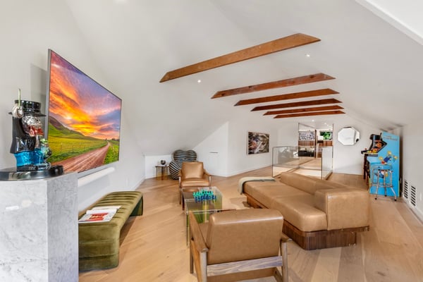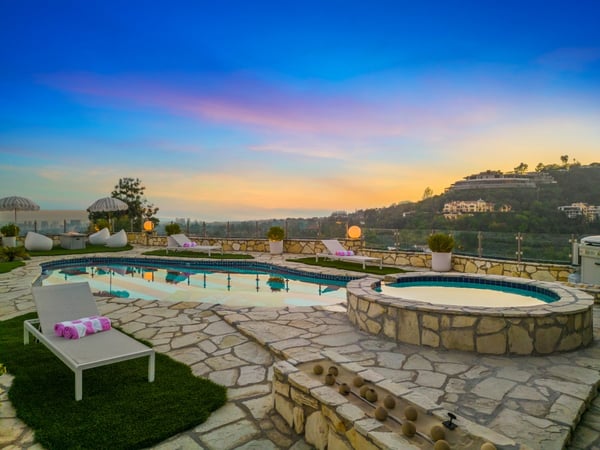 This property is only available for monthly stays with a minimum of 31 nights. If you are interested in short-term stays, please contact our Villa Specialists for your luxury travel needs. For the first time in over 40 years, this beautiful Beverly Hills home is available to experience in a state of restored glory. Nestled in the hills behind the Beverly Hills Hotel, the property boasts 280-degree views of mountains, hills, city, and ocean. Its outdoor space features a pool, jacuzzi, fire pits, and surround sound, creating a private paradise just blocks from Rodeo Dr. The entertaining spaces continue to the inside with a charming classic Hollywood built-in bar, gym, sauna, movie room, and a loft with views of the lush surroundings. This home is comprised of an expansive primary bedroom, two secondary bedrooms, and a detached guest room. All rooms feature their own ensuite, devoting a separate powder room for guests. The total living space flows over 6,400 sqft, making this hilltop estate a true retreat.