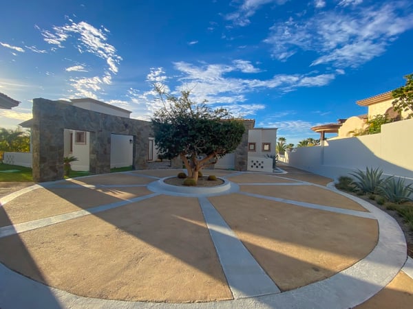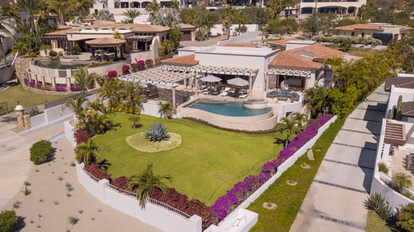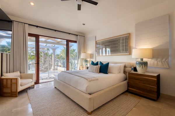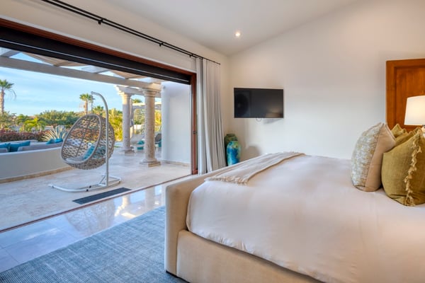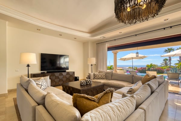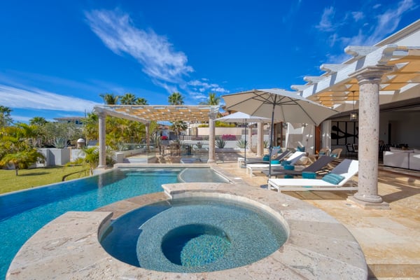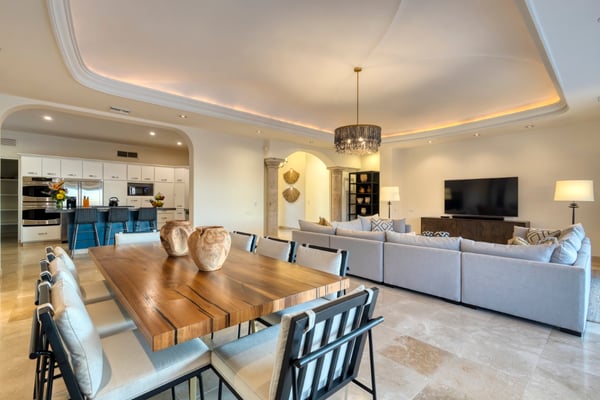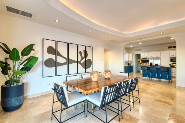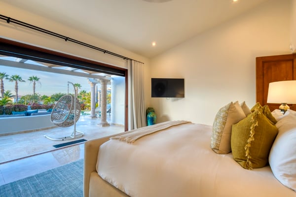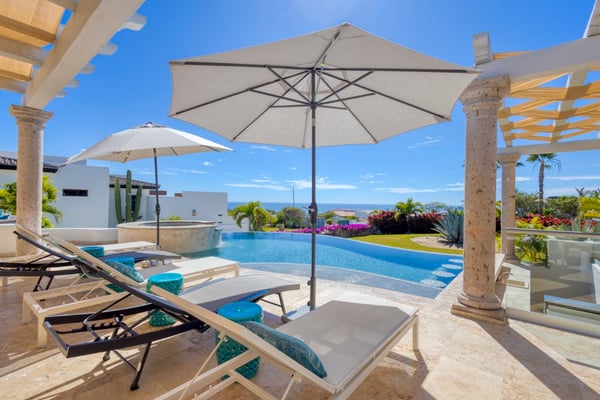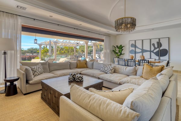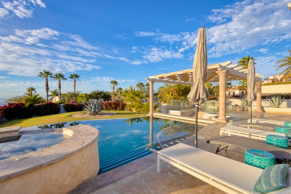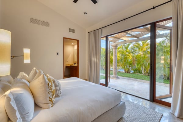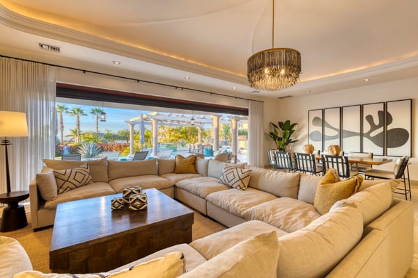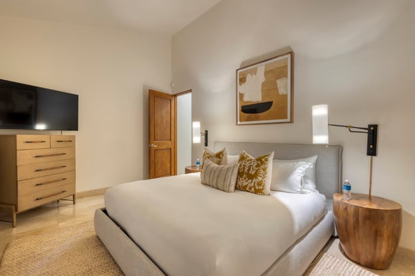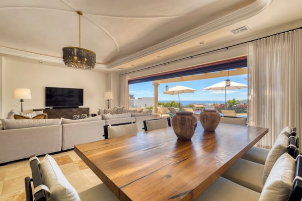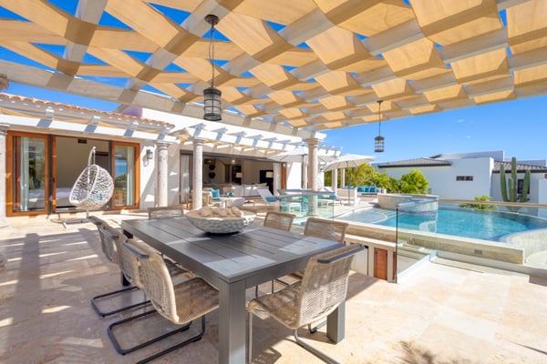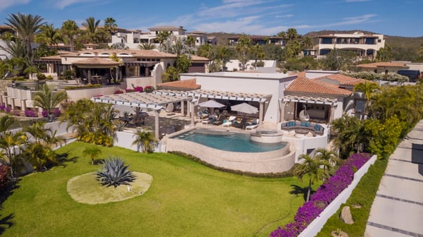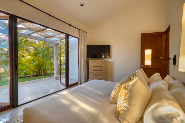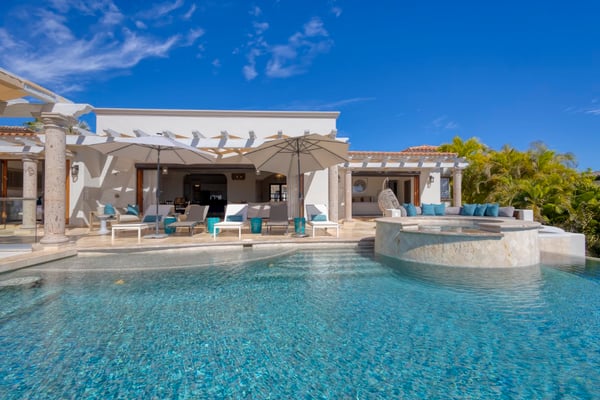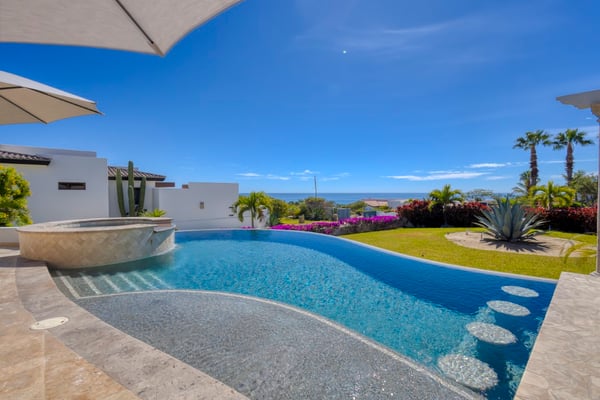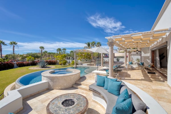 Casa Micana has four bedrooms a large open-concept living space, it's a hacienda-style home within an exclusive gated community, offering a secondary view of the lush golf course. Enjoy an expansive outdoor living area featuring an infinity-edge pool, swim-up bar, hot tub, barbecue area, fire pit, and spacious lawn area.