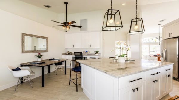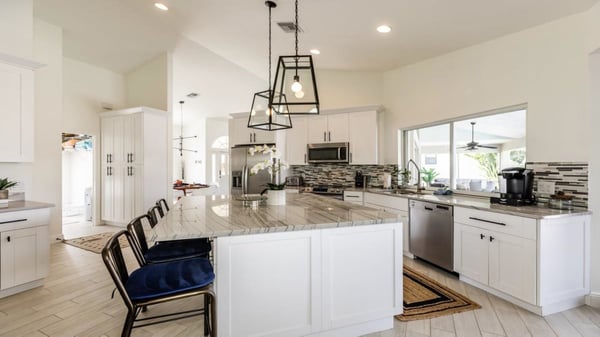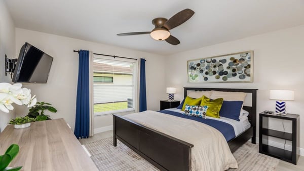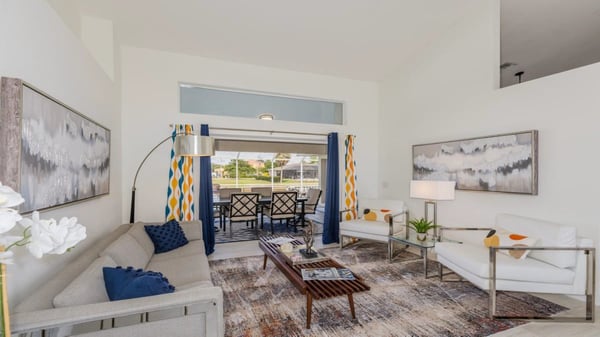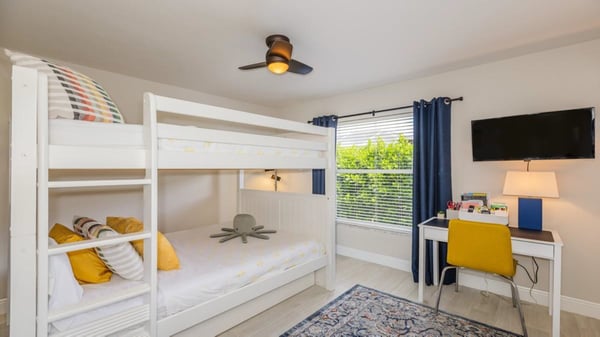 Modern, sleek, and chic are only a few words to describe this beautiful three-bedroom two two-bathroom home. Perfect getaway for couples and families alike, as this home is close to Mackle Park with amenities such as a kids zone, spray area, soccer fields, basketball courts, and a bike and walking path surrounding a lake. As you make your way into the home, you will find the family room with its comfortable L-shaped couch perfect for watching the big game, movie, or TV on this large flat-screen TV. Looking for a bit more solitude? The formal living room is where you will find a sleek grey couch with two armchairs, perfect for curling up and reading a good book. The bedrooms are just as comfortable and modern as the rest of the house. The primary bedroom boasts a king-sized bed and a gorgeous en-suite bathroom with a double sink vanity, soaking tub, and shower. The first guest bedroom with a queen-sized bed and a flat-screen TV shares a hallway and the second guest bedroom, with two sets of bunk beds. The guest bathroom has a large single-sink vanity and a walk-in shower. The kitchen boasts a beautiful breakfast bar with white and grey granite throughout, stainless steel appliances, and crisp white cabinets. The breakfast bar seats 4 comfortably, with an additional table for 2 and a dining room that seats 4. The kitchen has a great view of not only the family room but also a large pass-through window to watch the young ones enjoying the pool. Relax poolside with a table for 6 guests and a separate seating area. Perfect for watching the young ones swimming in the pool. If the beach is what you prefer, you will find towels, chairs, coolers, and possibly a raft or two, perfect for heading off to the beach to enjoy some sun and fun.