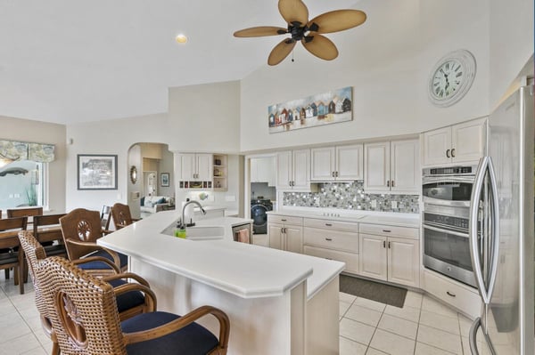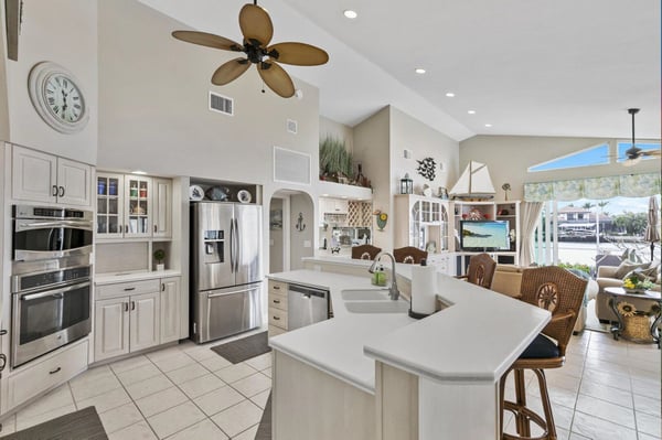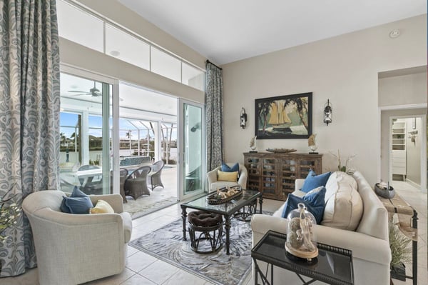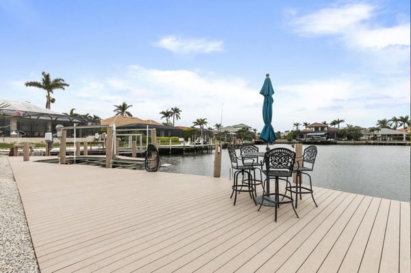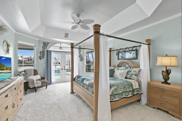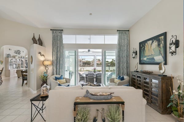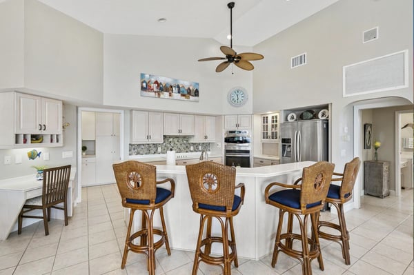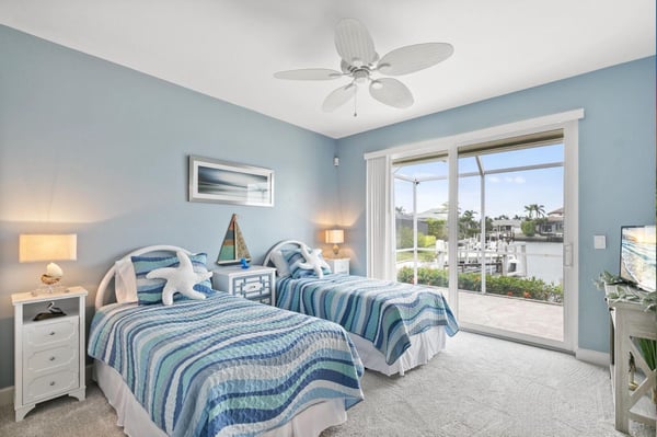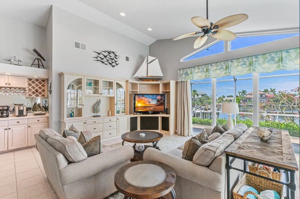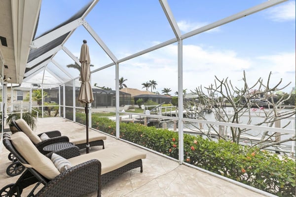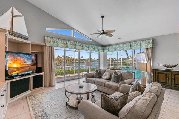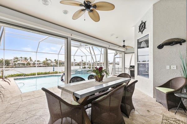 Welcome to your home-away-from-home on Marco Island, the three-bed, three-bath home has it all to make your next vacation unforgettable! Enjoy a double-doored entry with immediate west-facing views of your private pool and a luxurious indoor sitting area to take a load off after a day of adventuring on the island. You could step right out onto the lanai through the sliding glass door, or head to the left toward the main living area. Just before the open living space is a lushly carpeted home office if you need to send any last-minute emails before fully logging off and enjoying your vacation. The office offers views of the neighborhood and a cozy pull-out couch. Tall ceilings welcome you to your impressive open living space with great views of the dock, cerulean channel complete with indirect gulf access, and private pool. Two couches and a great TV offer a place to sink in and truly relax. To the left of the entry is counter space perfect for planning meals or sending a quick email making your reservation at the Island Bike Shop or Dolphin Cove Marina. This flows into a spacious kitchen that offers state-of-the-art appliances, ample counter space, and plenty of fridge space to hold all the refreshments you could desire. Don’t forget the coffee prep and wet bar counter between the kitchen and living room! Enjoy meals on the four high-top seats facing the kitchen, or the six-person dining table just to the right of the entryway and mere steps from the dock or the pool. Just off the kitchen is a generous laundry room so you can stay as long as you’d like. The outdoor space at this home is impressive with a covered lanai that offers a six-person table for pool-side dining, a large grill, a pool, and a spa. Enjoy reclining in the lounge chairs or step out to the dock for a high-top four-seat table next to your private boat access. The main suite offers quiet and privacy just to the right of the main entryway and seating area. The bedroom features a four-poster king bed, French doors to the pool, and a large TV for restful evenings with your favourite show. The impressive ensuite centers around the soaker tub with Jack and Jill sinks and a separate vanity next to the standing shower. The other two bedrooms and baths are off the kitchen and living area. The first offers a queen bed, a cozy window nook, and two closets. The second bath offers a walk-in shower, vanity, and expansive counter space. The third bedroom includes two twin beds and a sliding door out to a screened-in lanai just off the dock area. The ensuite bath spotlights white granite counters for the sink and vanity station, and the granite is continued in the walls of the walk-in shower. It’s hard to know if you’ll spend more time inside or out with a house that offers it all: panoramic views, a fully appointed kitchen, warm corners for reading, and a cool pool and spa for midday relaxing. Adventure or relax, Marco Island offers it all, and this home is the perfect home base.