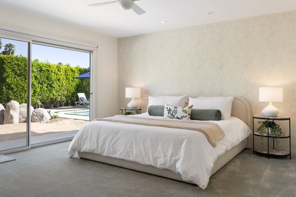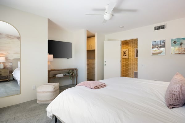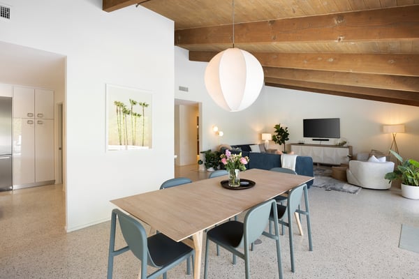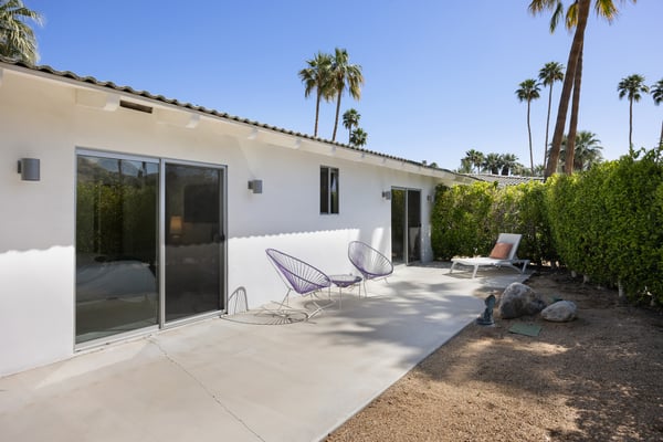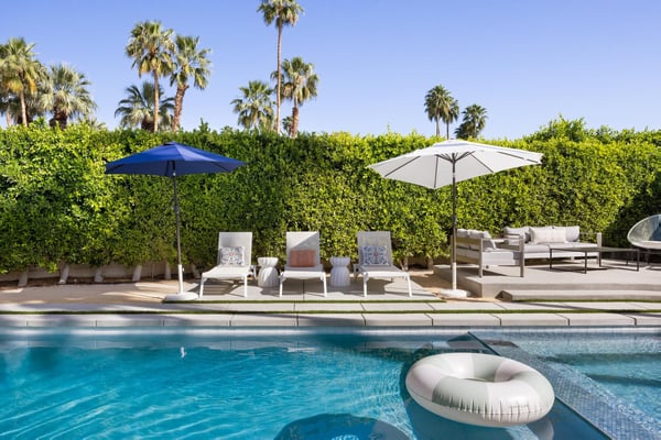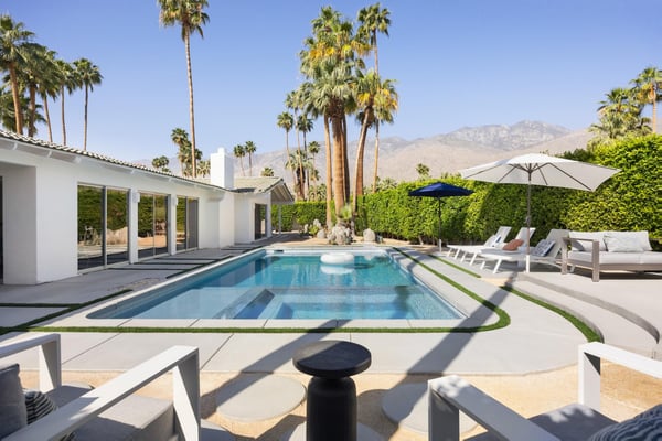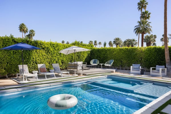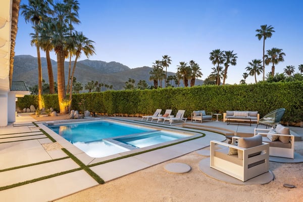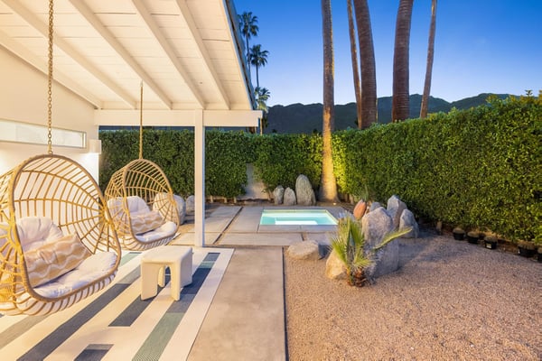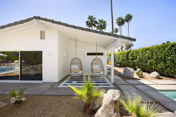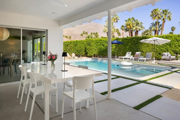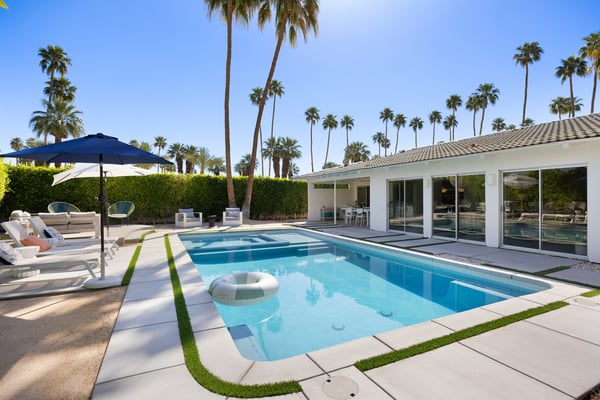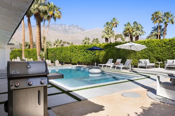 Set beneath the soaring San Jacinto mountains, Ledo Lounge is a 3-bedroom, 3.5-bathroom home in Palm Springs that comfortably sleeps 6. Explore nearby Joshua Tree National Park, browse the plethora of unique boutiques, or conquer the world-famous golf courses of this desert destination—and the fun doesn’t stop when the sun sets, thanks to the city’s thriving nightlife scene! Guests will love soaking up the California sunshine and mountain views while stretched out beside this 1-story home’s private pool and sitting spa. The backyard is equipped with a hot tub attached to the pool. Sleek, mid-century modern décor and natural light greet guests upon entry. A sloping, wood-paneled ceiling and arched fireplace add inviting warmth to the serene living area. Sink into the sumptuous blue sectional for a quiet evening of cocktails and conversation, as the 65” Smart TV and Sonos soundbar offer endless background entertainment. Artistic flair and contemporary design mingle in the well-appointed kitchen, equipped with Bosch appliances and an expansive island to make meal prep easy. Sunshine from 3 sliding glass doors leading out to the pool deck illuminates the pale wood dining table for 6, where guests can indulge in a sit-down dinner. Venture outside to discover a sun-drenched oasis surrounded by privacy hedges and swaying palm trees. Cool down with a luxurious swim in the private pool, or relax with a soak in the sitting spa. There’s plenty of outdoor seating, with 4 poolside loungers, a sitting area with 2 couches, and additional patio furniture scattered throughout the space. Throw kebabs and burgers on the propane grill and enjoy a lunchtime barbecue at the shaded 6-person table. When the day winds down, there are 2 guest bedrooms and 1 primary bedroom, all with king beds, private bathrooms, 55” Smart TVs, and sliding glass doors that open to the backyard. City of Palm Springs ID No. 5584