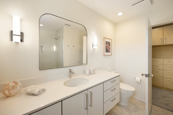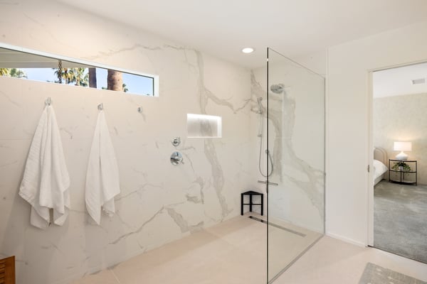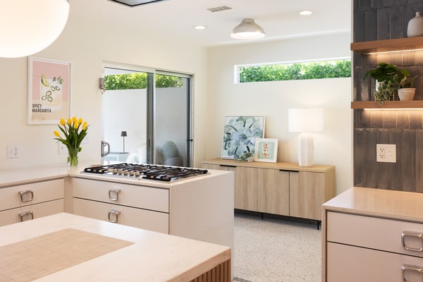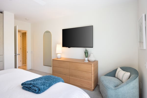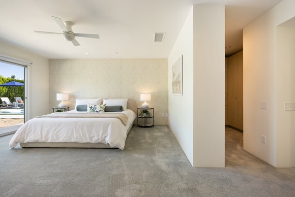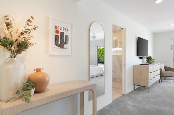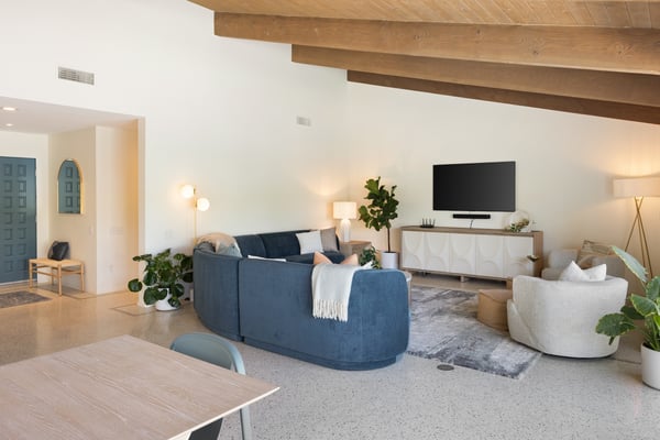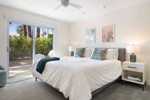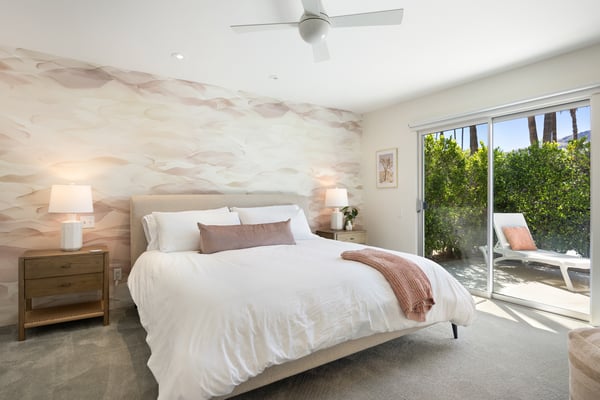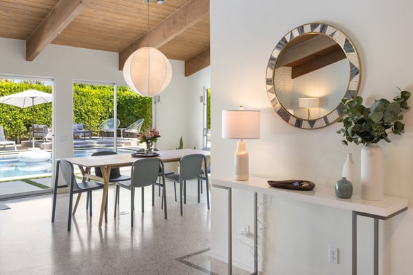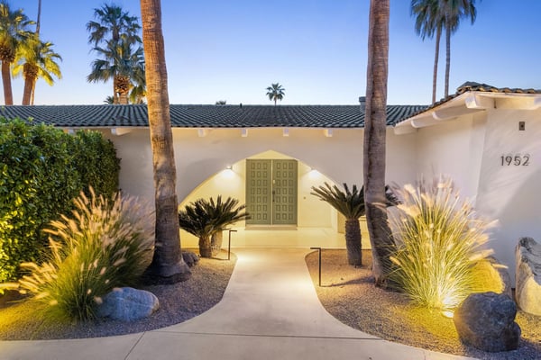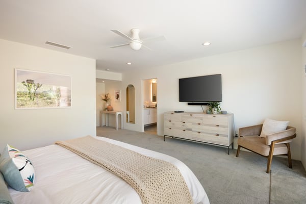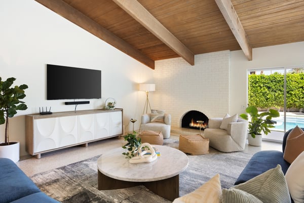 Set beneath the soaring San Jacinto mountains, Ledo Lounge is a 3-bedroom, 3.5-bathroom home in Palm Springs that comfortably sleeps 6. Explore nearby Joshua Tree National Park, browse the plethora of unique boutiques, or conquer the world-famous golf courses of this desert destination—and the fun doesn’t stop when the sun sets, thanks to the city’s thriving nightlife scene! Guests will love soaking up the California sunshine and mountain views while stretched out beside this 1-story home’s private pool and sitting spa. The backyard is equipped with a hot tub attached to the pool. Sleek, mid-century modern décor and natural light greet guests upon entry. A sloping, wood-paneled ceiling and arched fireplace add inviting warmth to the serene living area. Sink into the sumptuous blue sectional for a quiet evening of cocktails and conversation, as the 65” Smart TV and Sonos soundbar offer endless background entertainment. Artistic flair and contemporary design mingle in the well-appointed kitchen, equipped with Bosch appliances and an expansive island to make meal prep easy. Sunshine from 3 sliding glass doors leading out to the pool deck illuminates the pale wood dining table for 6, where guests can indulge in a sit-down dinner. Venture outside to discover a sun-drenched oasis surrounded by privacy hedges and swaying palm trees. Cool down with a luxurious swim in the private pool, or relax with a soak in the sitting spa. There’s plenty of outdoor seating, with 4 poolside loungers, a sitting area with 2 couches, and additional patio furniture scattered throughout the space. Throw kebabs and burgers on the propane grill and enjoy a lunchtime barbecue at the shaded 6-person table. When the day winds down, there are 2 guest bedrooms and 1 primary bedroom, all with king beds, private bathrooms, 55” Smart TVs, and sliding glass doors that open to the backyard. City of Palm Springs ID No. 5584