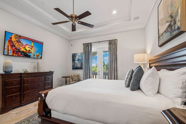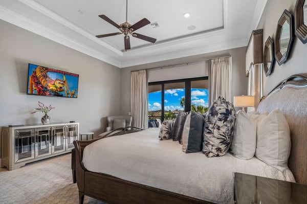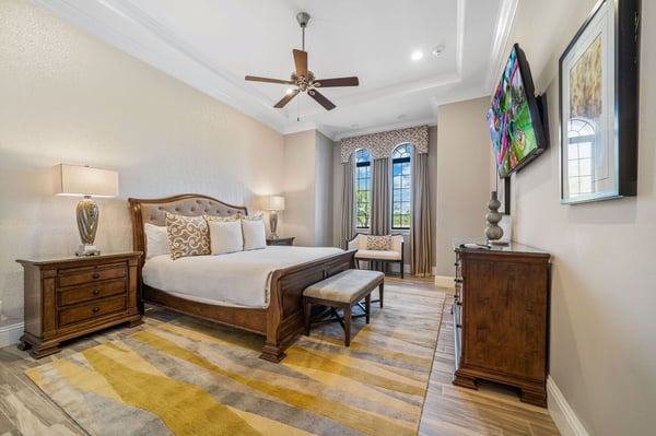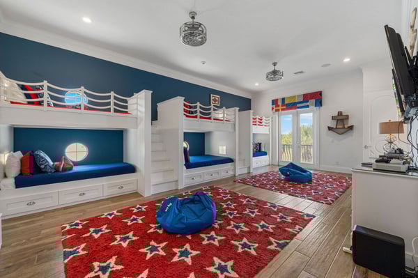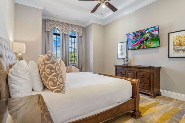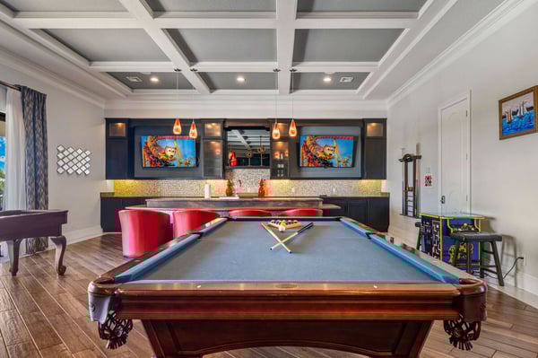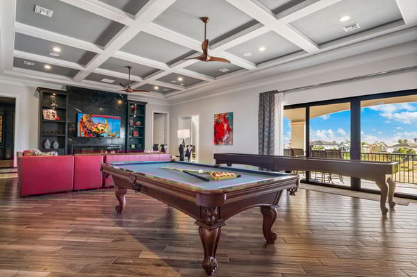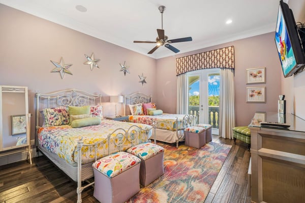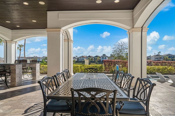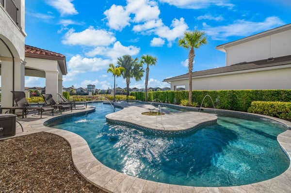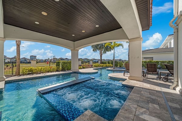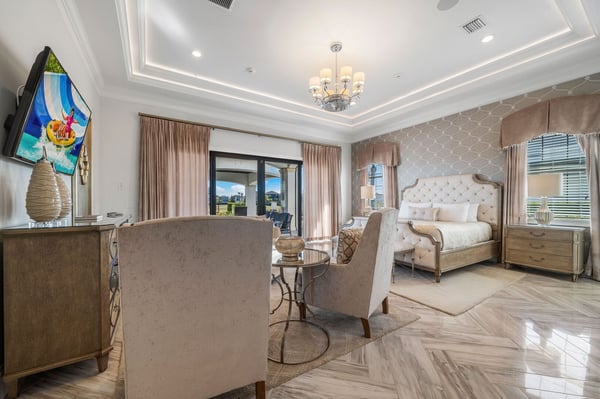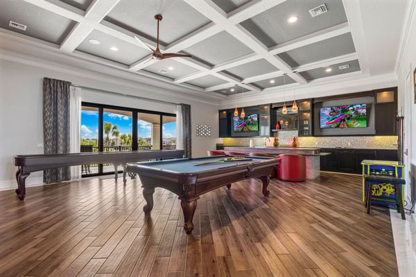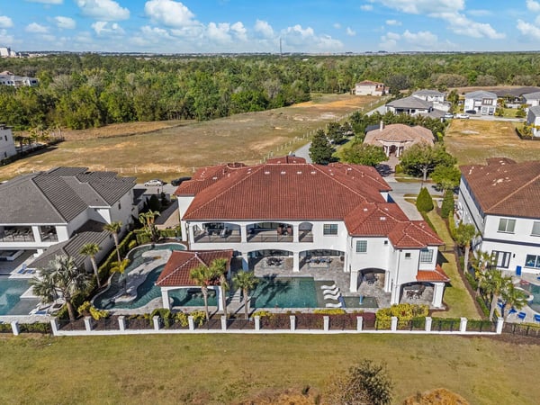 Welcome to Horizon Bay, an extraordinary 11,448 sq. ft. estate that embodies timeless elegance and modern luxury. This stunning 10-bedroom, 10-bathroom retreat sleeps up to 26 guests, making it an ideal destination for large family gatherings, group vacations, or special celebrations. From its striking Spanish tile roofing to its grand interiors featuring upscale traditional furnishings, Palacio del Sol is a masterpiece of design and comfort. Step inside to discover spacious rooms adorned with intricate trim and molding, creating a refined ambiance reminiscent of a regal castle. The expansive living areas are thoughtfully designed to balance elegance with functionality, providing the perfect spaces to relax, entertain, and connect with loved ones. The large master bedroom is a private sanctuary, boasting luxurious furnishings, ample space, and an en-suite bathroom designed for indulgence, complete with high-end finishes and spa-like features. Entertainment takes center stage at Horizon Bay. The home’s game loft is a vibrant space where guests of all ages can gather for friendly competition and fun. The dedicated movie theater offers a cinematic experience, complete with plush seating and state-of-the-art audiovisual equipment, perfect for movie nights or binge-watching your favorite shows. These entertainment options ensure that every moment at Horizon Bay is filled with enjoyment and relaxation. Step outside to the estate’s breathtaking outdoor area, a true oasis designed to celebrate Florida’s beautiful weather. The luxurious back patio features a fully equipped summer kitchen, ideal for al fresco dining or poolside barbecues. The sprawling pool invites you to take a refreshing dip, while the hot tub offers a soothing retreat after a day of adventure. Younger guests will delight in the splash pad, while the lazy river provides a tranquil experience for guests of all ages to unwind and float their cares away. The attention to detail extends to every corner of Horizon Bay, from the thoughtfully designed bedrooms to the inviting common spaces. Each bedroom is uniquely decorated with upscale traditional furniture, offering a serene retreat for rest and rejuvenation. High-quality linens, ample storage, and tasteful decor enhance the comfort of every guest, ensuring a restful stay. Located in the prestigious Eagle Estates community, Horizon Bay offers easy access to nearby attractions and exclusive resort-style amenities. Whether you’re lounging by the pool, enjoying a movie in the theater, or sharing meals prepared in the gourmet kitchen, this home is a destination in itself, designed to create unforgettable memories. Horizon Bay is more than just a vacation rental—it’s a statement of elegance, luxury, and timeless charm. Book your stay today and experience the ultimate in comfort, style, and relaxation at this one-of-a-kind estate.
