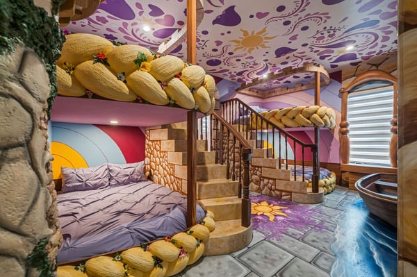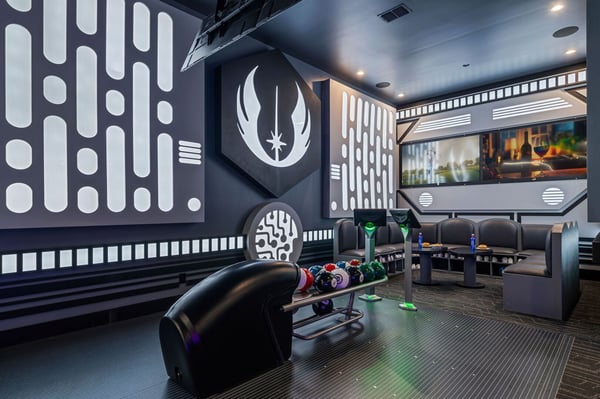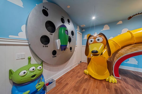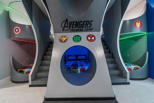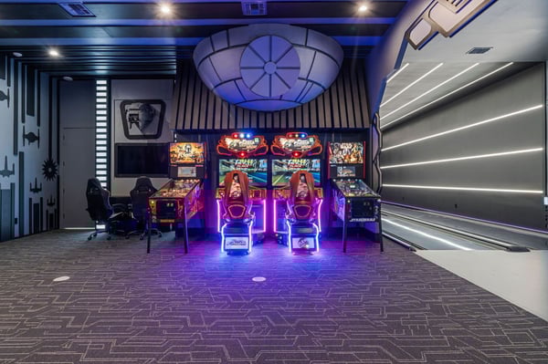 Welcome to your ultimate luxury getaway! This extraordinary 10-bedroom, 11.5-bathroom estate is designed to deliver an unforgettable vacation experience for large families, groups, or corporate retreats. With space to sleep up to 34 guests comfortably, this home blends high-end design, immersive entertainment, and resort-style amenities into one incredible destination. Step inside and be transported into a world of imagination and relaxation. Kids and adults alike will be enchanted by the themed bedrooms—little ones can dream big in the whimsical Rapunzel room or gear up for adventure in the action-packed Avengers room. The excitement continues in the Star Wars-themed arcade, complete with classic games and out-of-this-world décor, plus a private two-lane bowling alley that brings fun right to your doorstep. Entertainment knows no limits here. Enjoy movie nights in the private theatre room, challenge friends in the golf simulator, or gather around the upstairs bar area for evening cocktails and conversation. Outside, the resort-style pool invites you to unwind with a refreshing swim, soak in the spa, or fire up the grill in the fully equipped summer kitchen. With six lavish king bedrooms, additional well-appointed sleeping spaces, and 11.5 bathrooms, everyone can enjoy comfort and privacy. Whether you’re hosting a celebration or simply relaxing in style, this home offers the perfect blend of fun, luxury, and space for unforgettable memories.