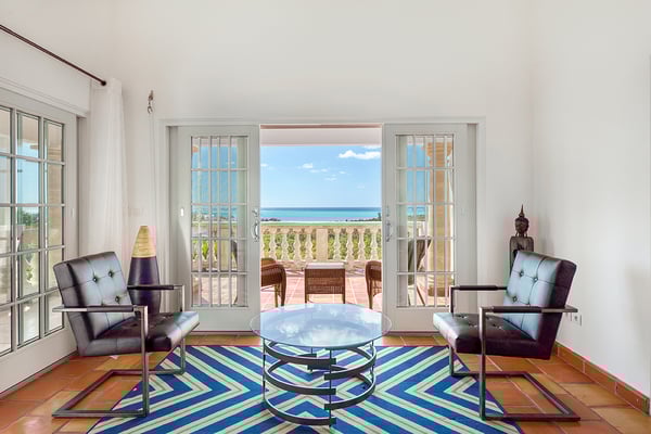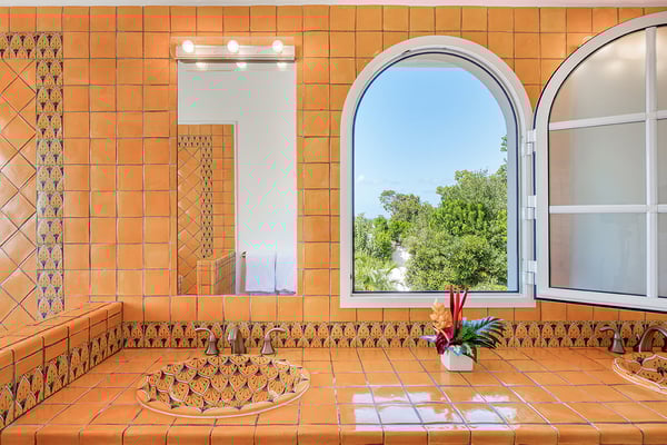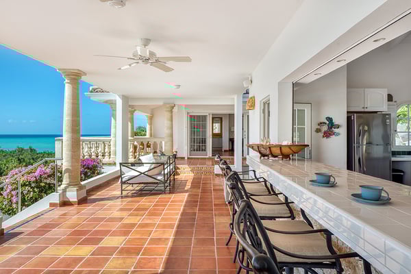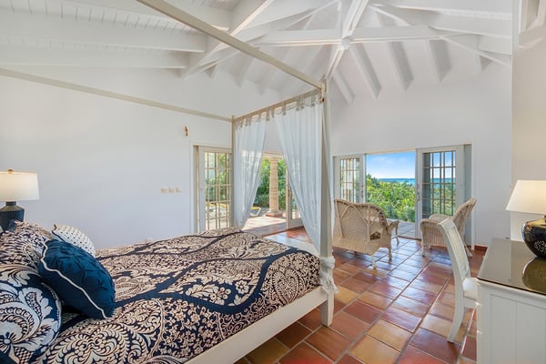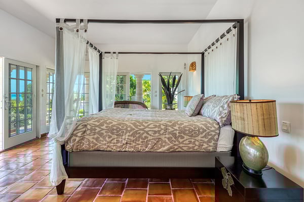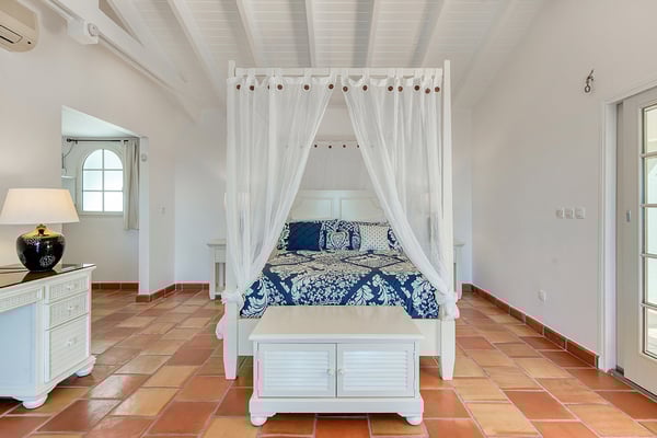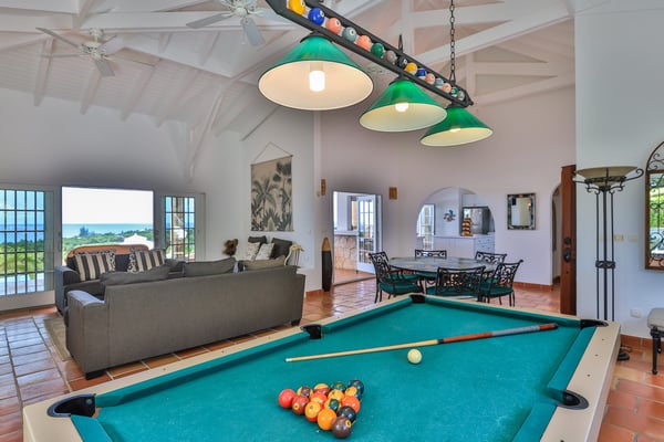 Villa Mariposa is an elegant Caribbean style villa with a romantic tropical atmosphere. Lush pink bougainvillea and palm-filled gardens, set in green lawns, draw the eye straight to breathtaking panoramic views. The house is perfect for outdoor living with multi-level terraces that descend from the main level to the large horseshoe-shaped pool and beyond to the lawn. Pool heating is optional at an additional $350 per week. If you wish to relax inside, while still enjoying sea views, step into the large comfortable living room with a full-sized pool table. Adjacent to the interior dining and living room is a well-equipped kitchen fitted with everything required for a gourmet meal. The four exterior access bedrooms are equal in size and air-conditioned. Two are placed at each end of the villa; one upper and one lower. Each bedroom has sea or pool views plus private terraces. The ensuite bathrooms are uniquely decorated in richly colored. From the oversized double showers, you view the ocean. Villa Mariposa will enchant your next stay in St Martin with family or among friends and can be rented as a two, three or a four-bedroom home!