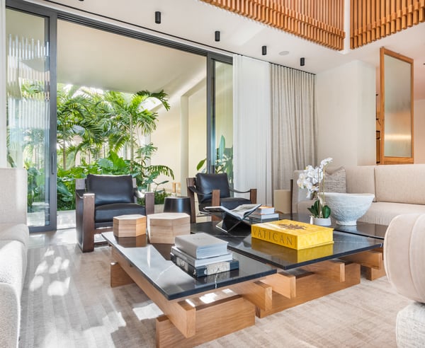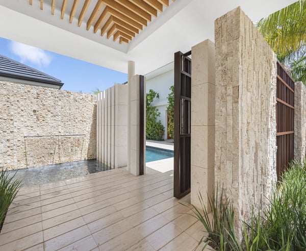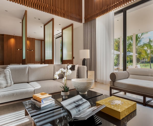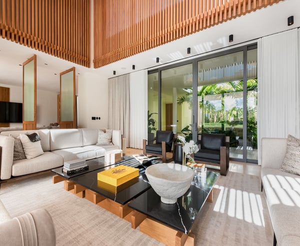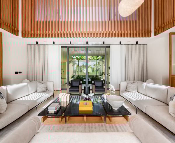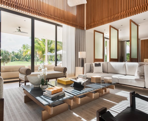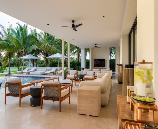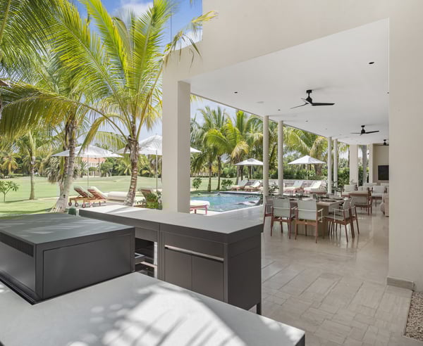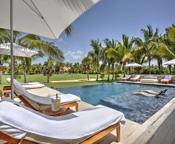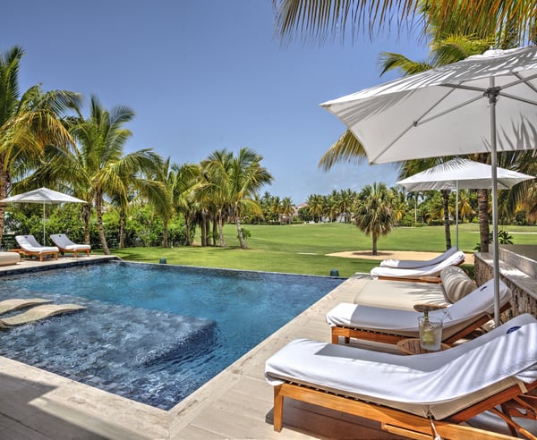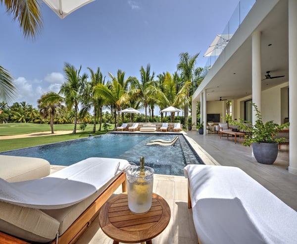 Guests staying within Puntacana Resort & Club will have access to all resort amenities and facilities. Resort amenities and facilities include two golf courses ($), two beach clubs ($), Six Senses Spa ($), restaurants ($), bars ($) and tennis centre ($). Discover La Serenissima, an 8-bedroom architectural sanctuary in Playa Serena, the most exclusive beachfront enclave of Puntacana Resort & Club. Just ten minutes from Punta Cana International Airport, this contemporary villa accommodates up to 16 guests with refined architecture, personalized service, and a dedicated spa. Here, time moves at your pace, whether you're savoring sunset cocktails, experiencing bespoke wellness treatments, or simply embracing the island's tranquil rhythm. La Serenissima embodies tropical modernism with Japandi influences: clean lines, earth-toned palettes, and natural textures that celebrate the island's beauty. The open-air entrance welcomes you with cascading water features, coral stone walls, and tropical hardwood that seamlessly connects indoor and outdoor living. The double-height living room features honey-toned wooden louvers that draw the eye upward to five floating white fixtures. Plush sofas, backless benches, and black leather armchairs create intimate conversation areas around a striking wood and marble coffee table. Every angle reveals views of the lush garden patio and the pool beyond. Two distinct pools define the outdoor experience—each in its own setting. At the entrance, a sleek lap pool invites refreshing morning swims, while in the backyard, an indulgent leisure pool with submerged loungers and optional heating becomes the perfect place to unwind. Shaded terraces offer ideal spots for relaxation, all enhanced by a Sonos system that carries your chosen soundtrack throughout the estate.